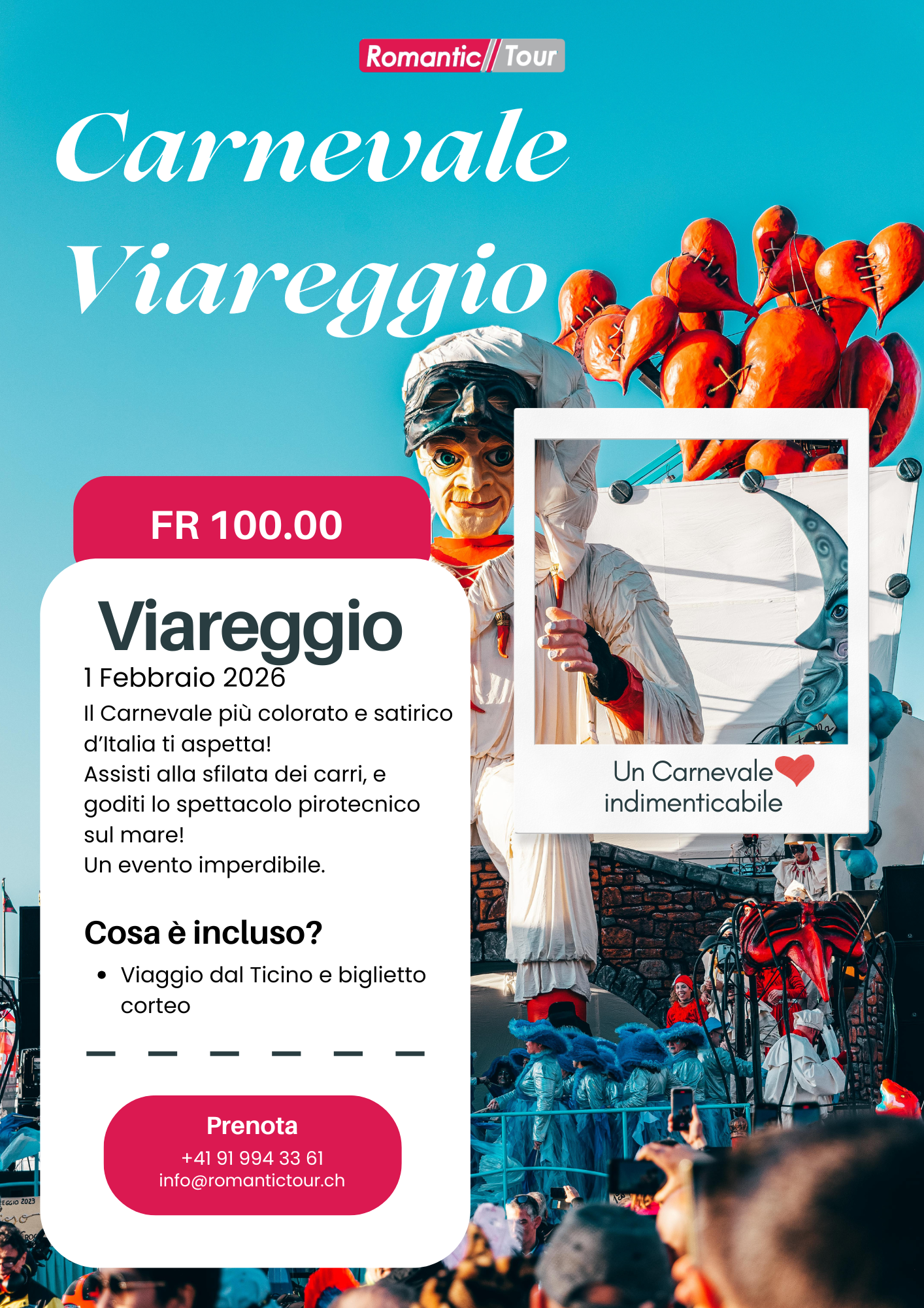Tra le vie del lungomare sfilano i giganteschi carri allegorici di cartapesta, vere opere d’arte che uniscono ironia, satira e fantasia in un’esplosione di colori, musica e allegria. L’atmosfera è contagiosa: maschere, coriandoli e danze animano ogni angolo della città, trasformando Viareggio in un palcoscenico a cielo aperto. Dopo la sfilata, tempo libero per una passeggiata sul mare o per gustare la cucina toscana. Un’esperienza divertente e indimenticabile, perfetta per vivere la spensieratezza del Carnevale italiano! 🎉