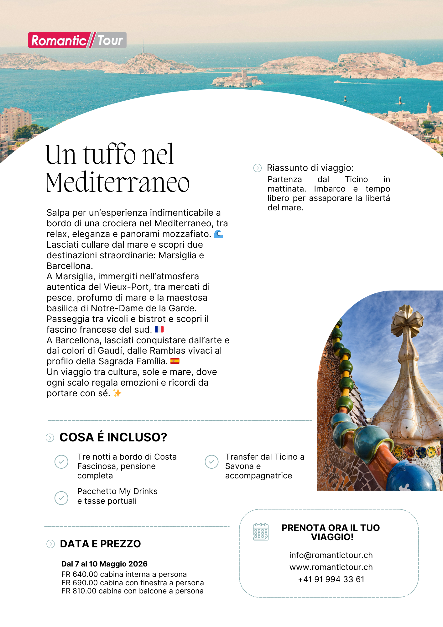 Salpa per un’esperienza indimenticabile a bordo di una crociera nel Mediterraneo, tra relax, eleganza e panorami mozzafiato. Lasciati cullare dal mare e scopri due destinazioni straordinarie: Marsiglia e Barcellona. A Marsiglia, immergiti nell’atmosfera autentica del Vieux-Port, tra mercati di pesce, profumo di mare e la maestosa basilica di Notre-Dame de la Garde. Passeggia tra vicoli e bistrot e scopri il fascino francese del sud. A Barcellona, lasciati conquistare dall’arte e dai colori di Gaudí, dalle Ramblas vivaci al profilo della Sagrada Família. Un viaggio tra cultura, sole e mare, dove ogni scalo regala emozioni e ricordi da portare con sé. ✨