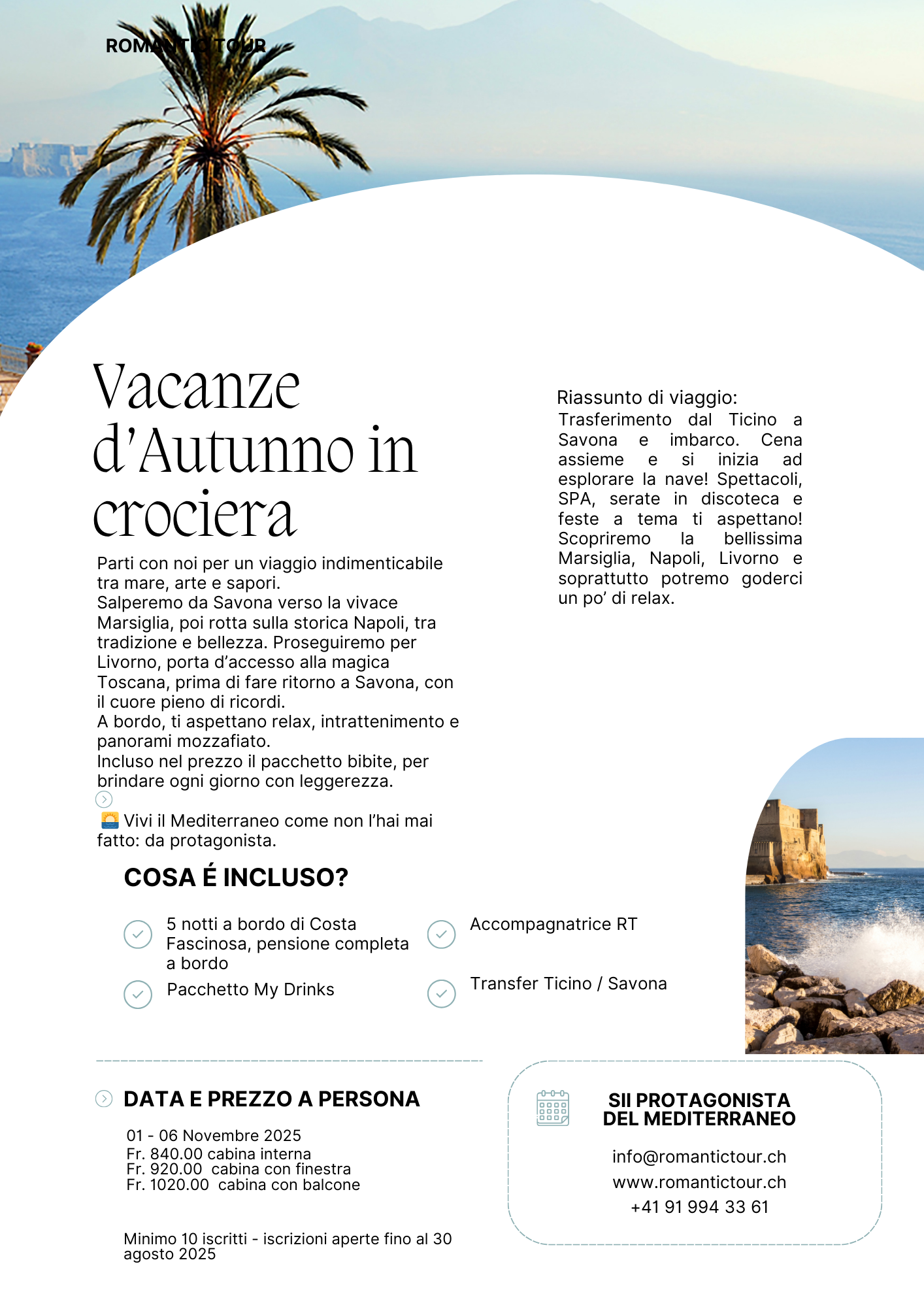 E se l’autunno iniziasse… in mezzo al mare? Non una semplice vacanza. Una pausa dal tempo. Un viaggio che profuma di sale, luci dorate al tramonto, risate sotto le stelle. Dal 1 al 6 novembre, salpa con noi per una crociera nel cuore del Mediterraneo. Un itinerario che incanta: 🚢 Savona – Marsiglia – Napoli – Livorno – Savona Ogni tappa è un’emozione nuova: il fascino francese, la vitalità del sud, la dolcezza toscana.