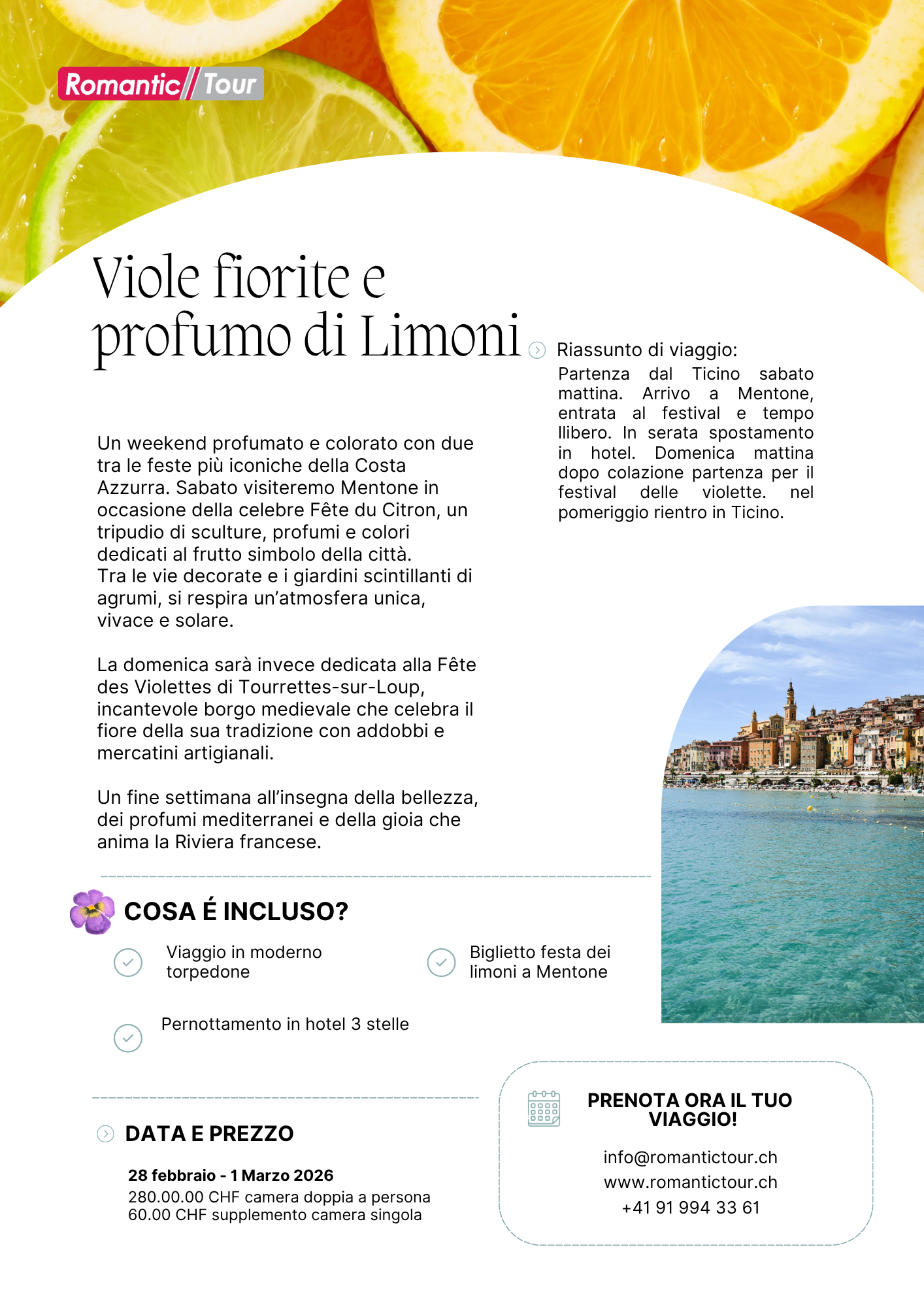 Un weekend profumato e colorato tra due tra le feste più iconiche della Costa Azzurra. Sabato visiteremo Mentone in occasione della celebre Fête du Citron, un tripudio di sculture, profumi e colori dedicati al frutto simbolo della città. Tra le vie decorate e i giardini scintillanti di agrumi, si respira un’atmosfera unica, vivace e solare. La domenica sarà invece dedicata alla Fête des Violettes di Tourrettes-sur-Loup, incantevole borgo medievale che celebra il fiore della sua tradizione con addobbi, mercatini artigianali e la spettacolare battaglia di fiori. Un fine settimana all’insegna della bellezza, dei profumi mediterranei e della gioia primaverile che anima la Riviera francese.